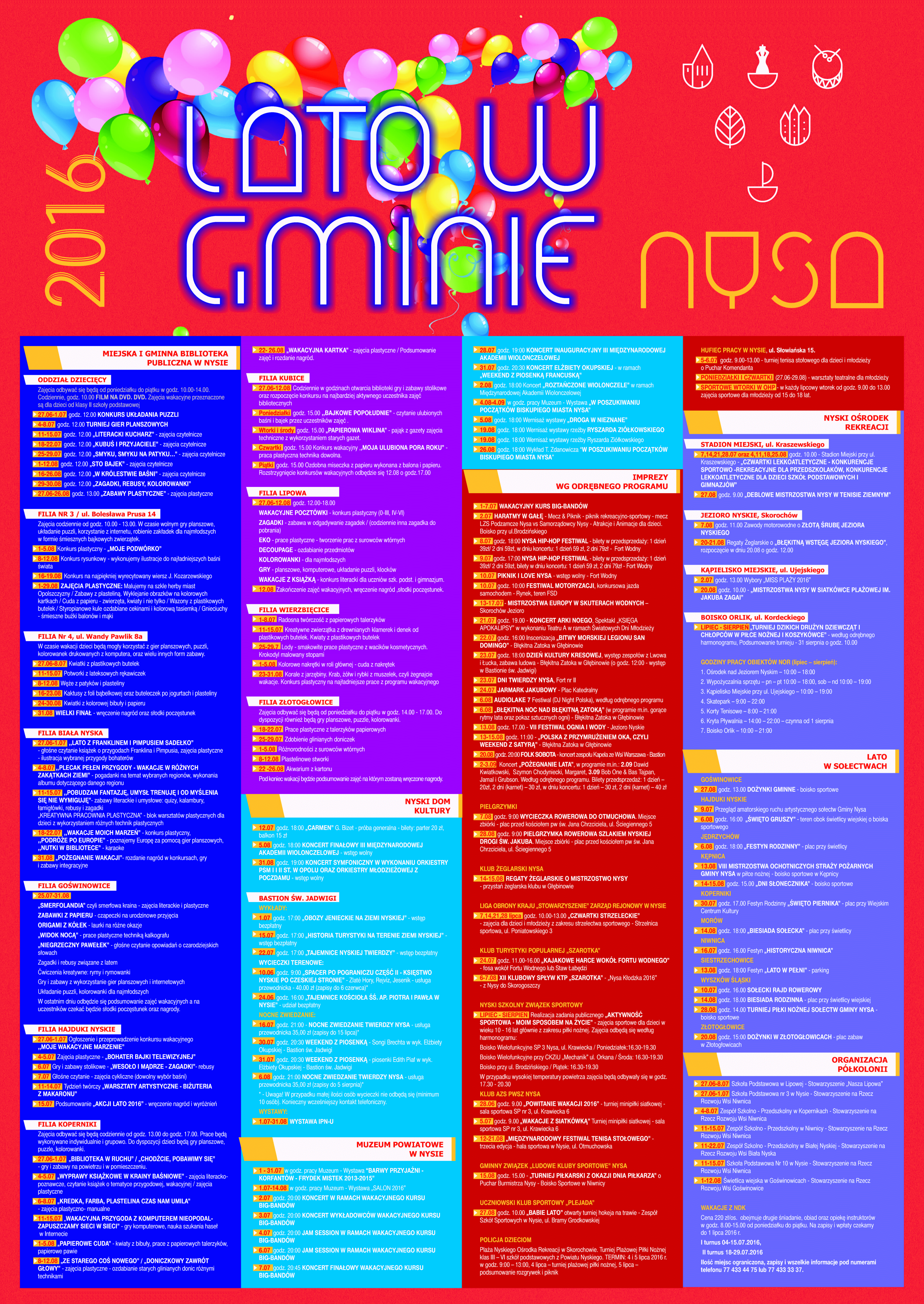 Przed nami lato pełne atrakcji. Zachęcamy do sprawdzenia w kalendarzu imprez, co przygotowały poszczególne placówki w wydarzeń rozrywkowych, sportu i rekreacji. Nocne zwiedzanie Twierdzy Nysa z przewodnikami z Informacji Turystycznej, koncerty w ramach Wakacyjnego Kursu Big-Bandów, Jarmark Jakubowy, czwartki lekkoatletyczne, Festiwal Ognia i Wody oraz koncert gwiazd na pożegnanie lata - to tylko niektóre z licznych propozycji.