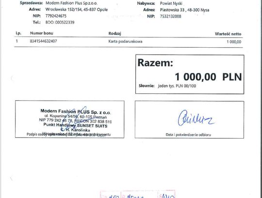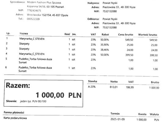 9 stycznia 2025 r. kartą powiatu kupiono kartę podarunkową za 1000 zł, która – według faktury – miała zostać wymieniona na koszule dla zespołu występującego podczas koncertu „Melodie Wdzięczności”. Jak ustaliło stowarzyszenie „Nysa Patrzy”, koszul nie kupiono. Karta została wymieniona na dwie marynarki i dwie pary skarpetek. Modele marynarek odpowiadają tym, w których starosta pojawiał się później w lokalnych mediach, co wskazuje na prywatny zakup sfinansowany ze środków publicznych.