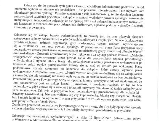 To nie jedyne kontrowersje związane z kartami podarunkowymi. Kartą powiatu opłacono również 500 zł „na krawaty” oraz 400 zł „dla wokalistki”, lecz brak potwierdzenia, że świadczenia trafiły do wskazanych osób.